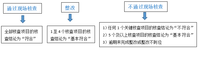 在這24個核查項目中,上述的5個關(guān)鍵核查項目的核查結(jié)論分為“符合”以及“不符合”;而其余19個一般核查項目的核查結(jié)論分為“符合”、“基本符合”和“不符合”。根據(jù)核查結(jié)論的匯總數(shù)量分別做出如下核查決定: