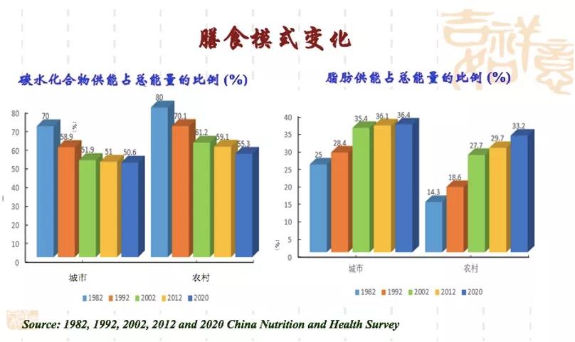 從飲食的攝入情況分析看到,1992年至2020年,城市和農(nóng)村居民膳食能量攝入量均有所下降,城市:2450Kcal/標準人日降至1940 Kcal/標準人日;農(nóng)村:2509 Kcal/標準人日降至2054 Kcal/標準人日。然而,從膳食模式30年的變遷中,我們看到城市和農(nóng)村居民碳水化合物供能占總能量的比例逐漸下降,脂肪供能占總能量的比例逐漸增高。
