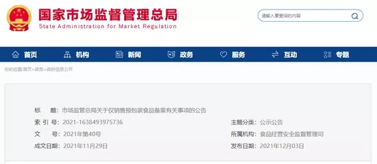 2021年12月3日,國家市場(chǎng)監(jiān)督管理總局發(fā)布了《關(guān)于僅銷售預(yù)包裝食品備案有關(guān)事項(xiàng)的公告》(國家市場(chǎng)監(jiān)督管理總局公告2021年第40號(hào),以下簡(jiǎn)稱《公告》)。