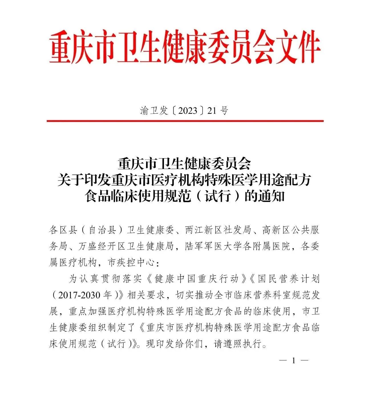 重慶市衛(wèi)健委發(fā)布關(guān)于 「特醫(yī)食品」 臨床使用規(guī)范(試行)的通知