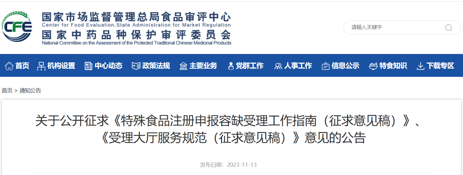 11月13日,市監(jiān)總局食品審評中心公開征求《特殊食品注冊申報容缺受理工作指南(征求意見稿)》意見的公告。