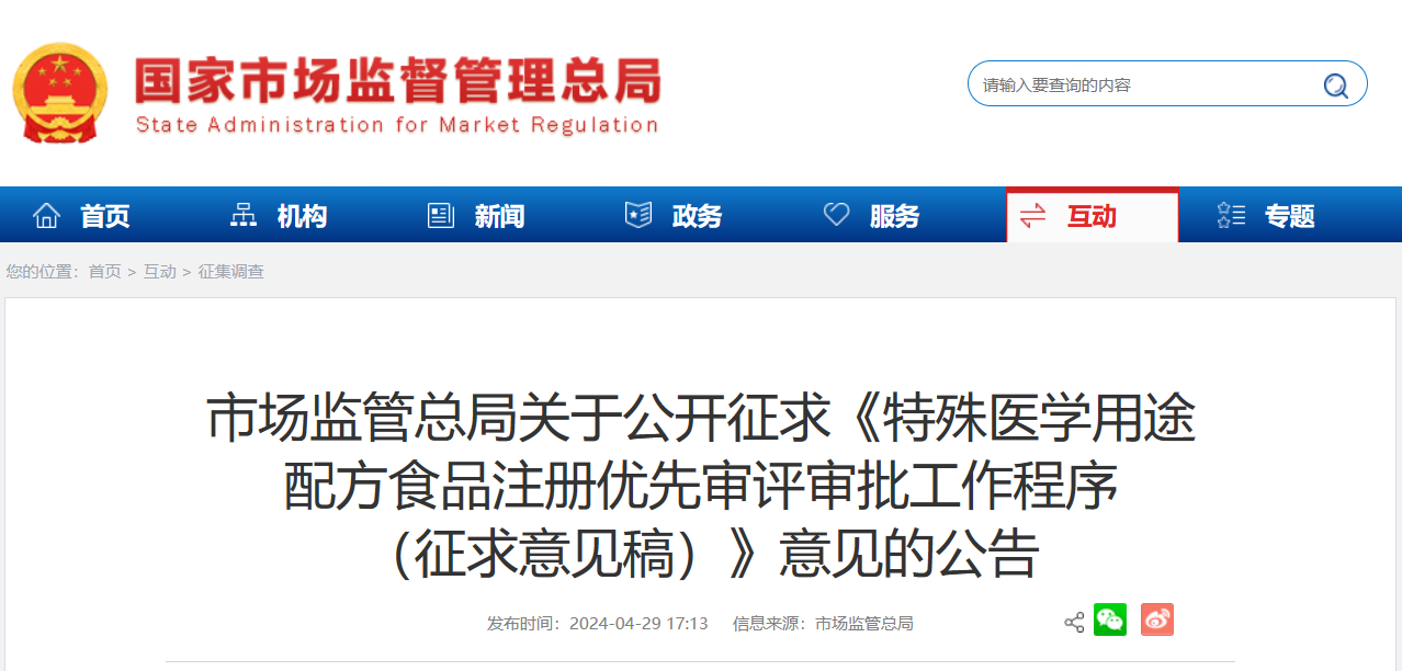 4月30日,國家市場監(jiān)督管理總局發(fā)布了關于公開征求《特殊醫(yī)學用途配方食品注冊優(yōu)先審評審批工作程序(征求意見稿)》意見的公告。