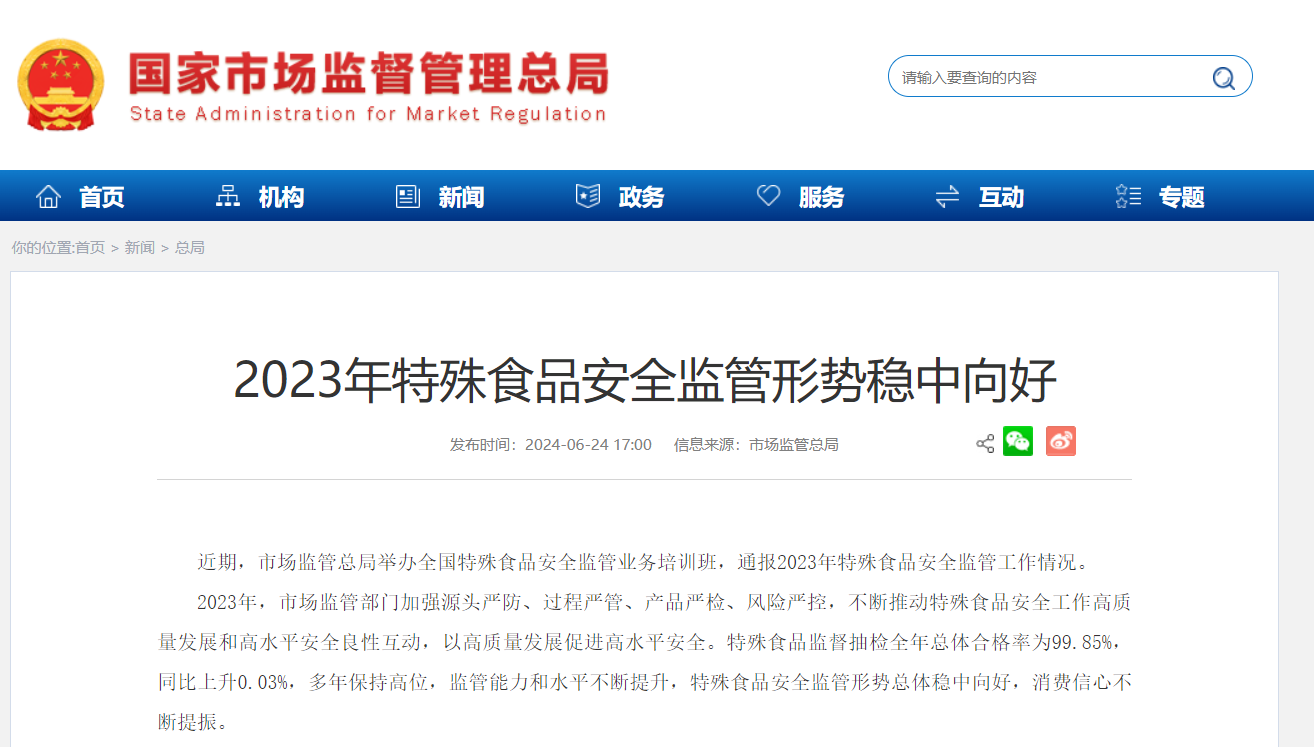 2023年特殊食品抽檢總體合格率為99.85%, 安全監(jiān)管形勢(shì)穩(wěn)中向好