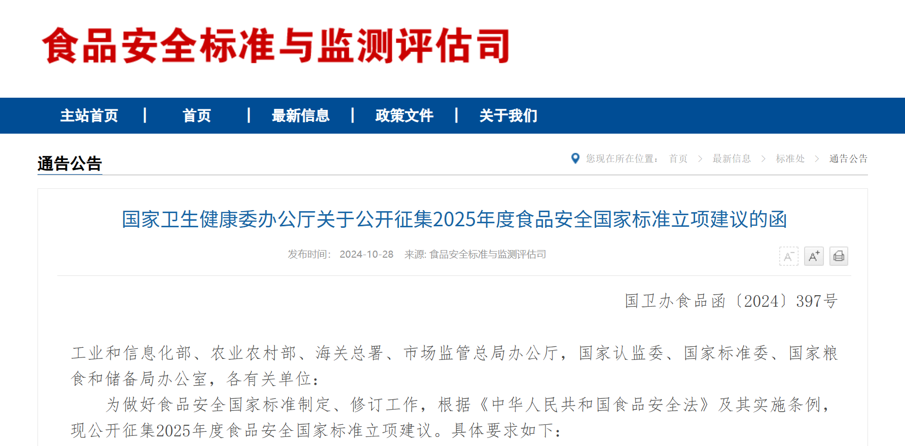 官方公告丨國家衛(wèi)生健康委辦公廳關(guān)于公開征集2025年度食品安全國家標準立項建議的函