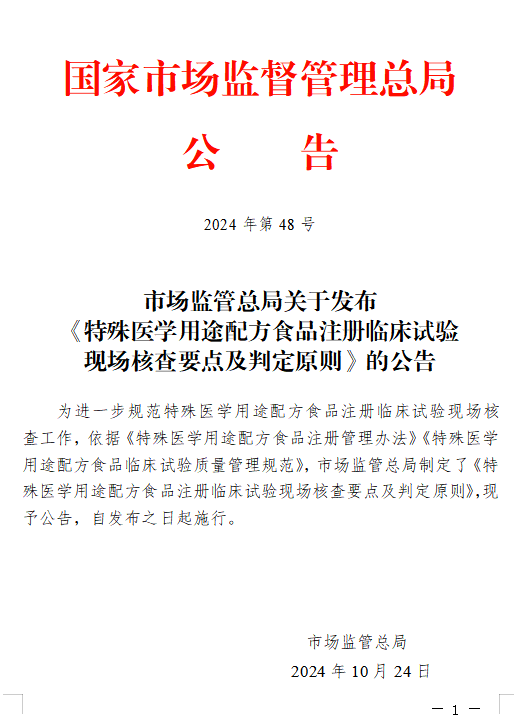 市場(chǎng)監(jiān)管總局關(guān)于發(fā)布《特殊醫(yī)學(xué)用途配方食品注冊(cè)臨床試驗(yàn)現(xiàn)場(chǎng)核查要點(diǎn)及判定原則》的公告