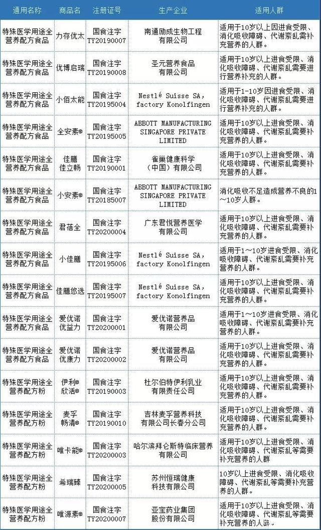 表1 全營(yíng)養(yǎng)配方食品上市目錄(中國(guó))