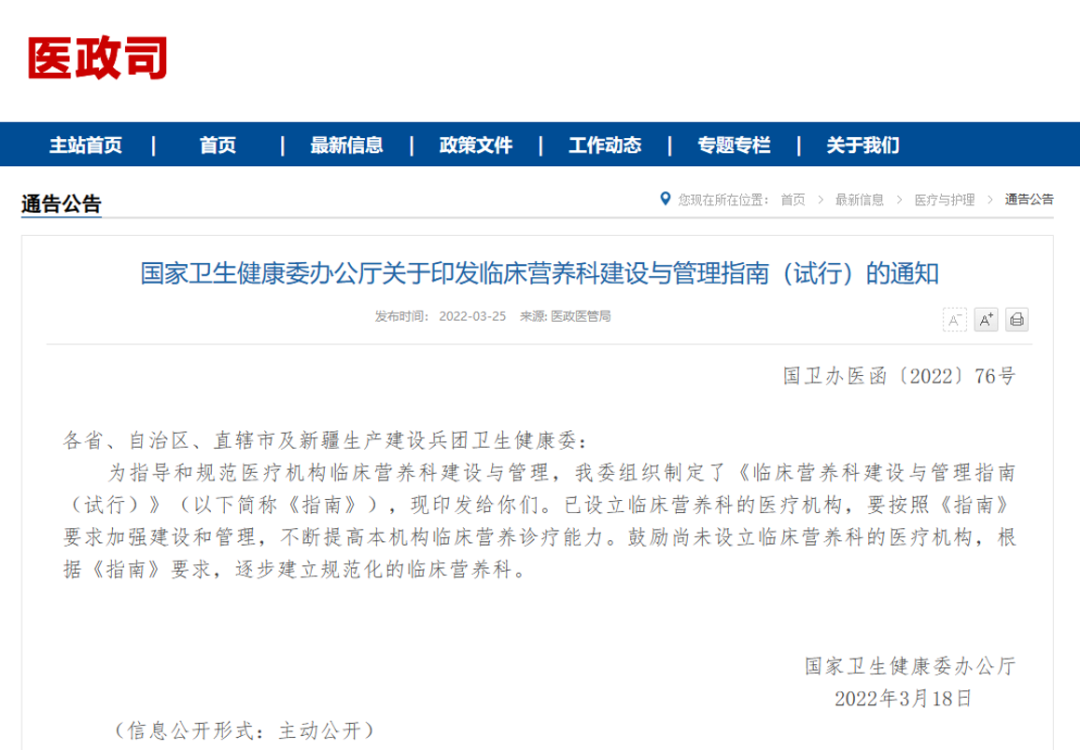 2022年3月25日國家衛(wèi)生健康委辦公廳發(fā)布了關(guān)于印發(fā)臨床營養(yǎng)科建設(shè)與管理指南(試行)的通知:已設(shè)立臨床營養(yǎng)科的醫(yī)療機(jī)構(gòu)要按照《指南》要求加強(qiáng)建設(shè)和管理,不斷提高本機(jī)構(gòu)臨床營養(yǎng)診療能力。鼓勵(lì)尚未設(shè)立臨床營養(yǎng)科的醫(yī)療機(jī)構(gòu),根據(jù)《指南》要求,逐步建立規(guī)范化的臨床營養(yǎng)科。二級以上綜合醫(yī)院以及腫瘤、兒童、精神等??漆t(yī)院設(shè)置臨床營養(yǎng)科,應(yīng)當(dāng)按照本指南進(jìn)行建設(shè)和管理。