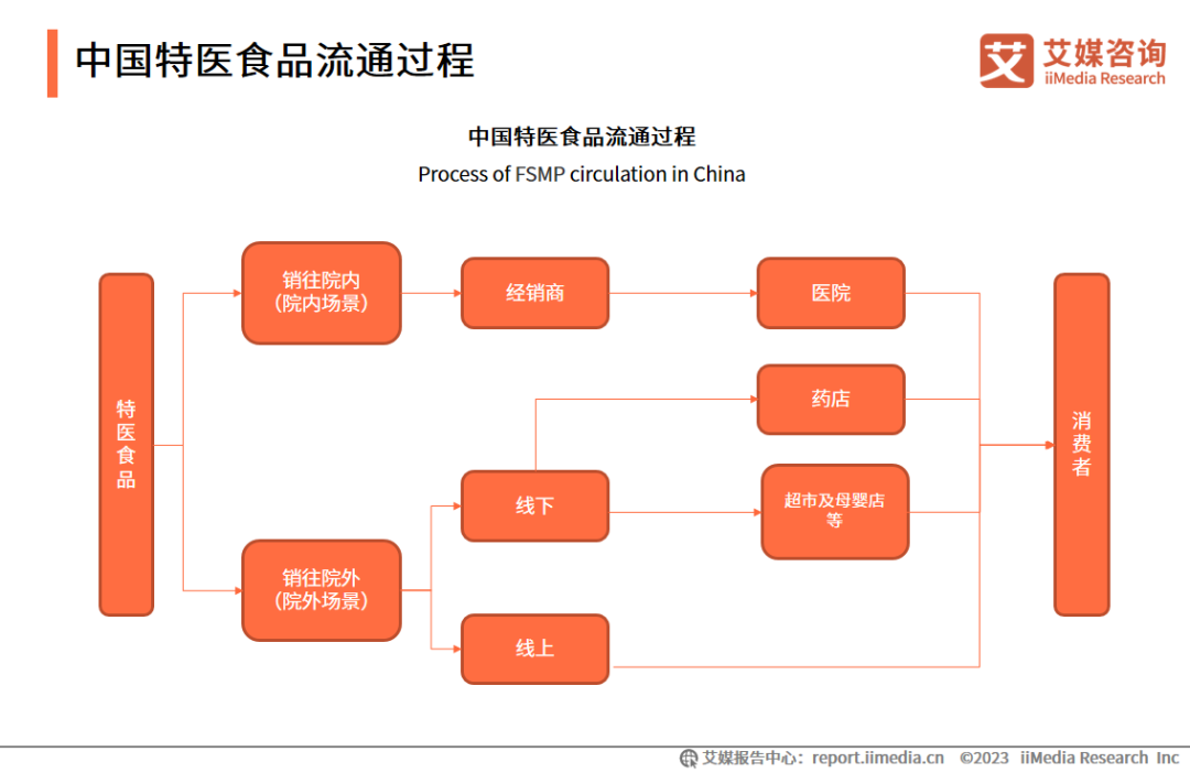 特醫(yī)食品的流通包括了院內(nèi)和院外兩部分。院內(nèi)特醫(yī)食品主要通過招標(biāo)和采購兩種方式進(jìn)入醫(yī)院庫房,患者通過營養(yǎng)科醫(yī)師的醫(yī)囑或處方進(jìn)行購買使用。院外則分為線上和線下兩部分,其中線下包括藥店、超市和母嬰店等;線上,特醫(yī)食品則通過第三方平臺或自建渠道銷售。