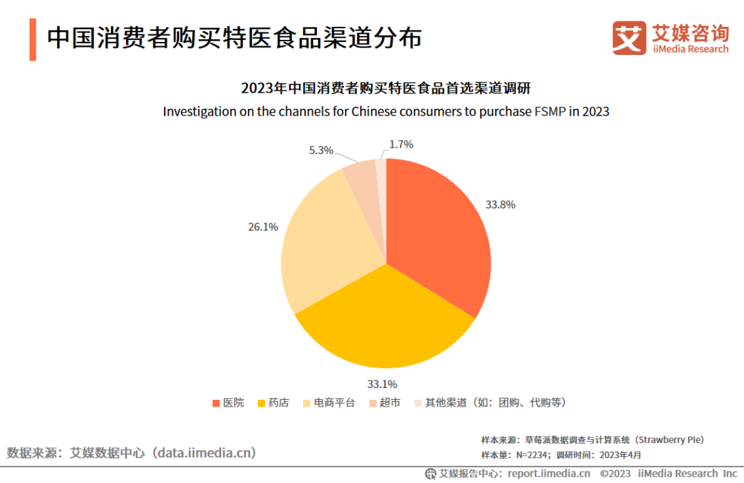專業(yè)衛(wèi)生機(jī)構(gòu)目前是特醫(yī)食品銷售的主流渠道。iiMedia Research(艾媒咨詢)調(diào)研數(shù)據(jù)顯示,近7成消費(fèi)者首選線下衛(wèi)生機(jī)構(gòu)購買特醫(yī)食品,其中有33.8%的消費(fèi)者首選醫(yī)院,33.1%的消費(fèi)者首選藥店;僅有26.1%的消費(fèi)者首選線上渠道。