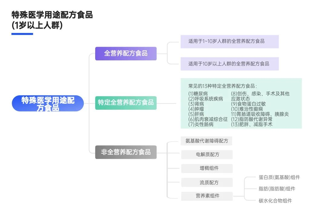 1歲以上人群的特醫(yī)食品,是指為滿足進食受限、消化吸收障礙、代謝紊亂或者特定疾病狀態(tài)人群對營養(yǎng)素或者膳食的特殊需要,專門加工配制而成的配方食品。根據(jù)不同臨床需求和適用人群,又分為三類,即全營養(yǎng)配方食品、特定全營養(yǎng)配方食品和非全營養(yǎng)配方食品,具體分類如下: