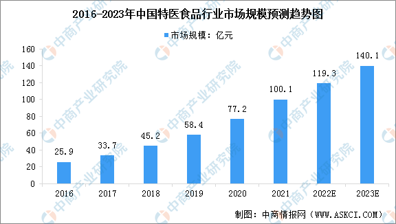 近年來,提高免疫力的食品和功能性食品受到市場(chǎng)歡迎,從而推動(dòng)特醫(yī)食品市場(chǎng)規(guī)模快速增長(zhǎng)。數(shù)據(jù)顯示,2016-2020年中國(guó)特醫(yī)食品市場(chǎng)規(guī)模從25.9億元增長(zhǎng)至77.2億元,年均復(fù)合增長(zhǎng)率高達(dá)31.40%。目前,我國(guó)只有1.6%的營(yíng)養(yǎng)不良患者在食用特醫(yī)食品,行業(yè)未來增長(zhǎng)空間廣闊,預(yù)計(jì)到2023年中國(guó)特醫(yī)食品市場(chǎng)規(guī)模將達(dá)到140.1億元。