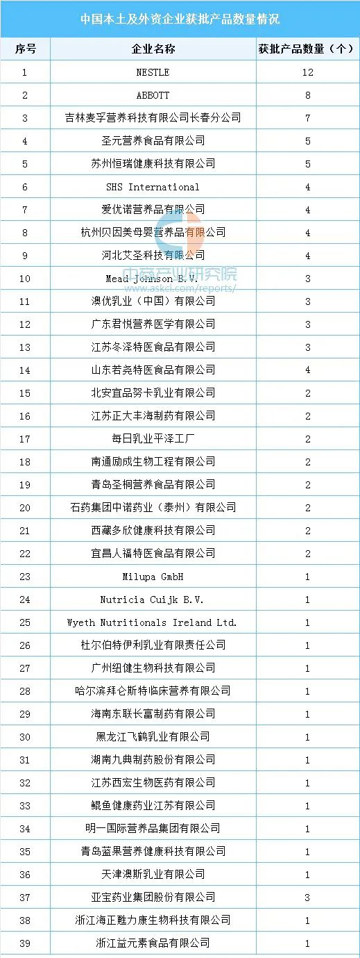 據(jù)統(tǒng)計(jì),目前已獲批的104個(gè)特醫(yī)食品相關(guān)產(chǎn)品中,共涉及39家企業(yè)。其中外資企業(yè)共7家,分別是雀巢、雅培、紐迪希亞、美贊臣、美樂寶、每日乳業(yè)、惠氏公司;本土企業(yè)共32家,獲批產(chǎn)品數(shù)量排名靠前的企業(yè)包括吉林麥孚、圣元營(yíng)養(yǎng)、恒瑞健康、愛優(yōu)諾、貝因美、亞寶特醫(yī)、艾圣科技、澳優(yōu)乳業(yè)、君悅營(yíng)養(yǎng)、冬澤特醫(yī)等,具體情況如下圖所示: