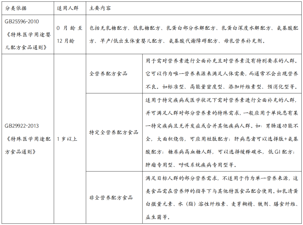 中國國家衛(wèi)生計生委員會(現(xiàn)國家衛(wèi)生健康委員會)于2010年和2013年分別發(fā)布了《特殊醫(yī)學(xué)用途嬰兒配方食品通則》與《特殊醫(yī)學(xué)用途配方食品通則》首次將嬰兒與非嬰兒特殊醫(yī)學(xué)用途配方食品的概念引入中國。特醫(yī)食品,全稱特殊醫(yī)學(xué)用途配方食品Foods for Special Medical Purposes,F(xiàn)SMP),也叫普通醫(yī)用營養(yǎng)品General Medical Nutrition),是不同于普通食品、保健品和普通藥品,需要特殊食物管理的患者在醫(yī)生指導(dǎo)下進(jìn)行服用的一類具有特殊食物用途的食品,包括適用于0—12月齡的特殊醫(yī)學(xué)用途嬰兒配方食品和適用于1歲以上人群的特醫(yī)食品。與普通食品相比,特醫(yī)食品的所有成分均為已知的安全可靠營養(yǎng)成分,不得存在功能未經(jīng)驗證的活性物質(zhì),認(rèn)證流程嚴(yán)格,且需強調(diào)在專屬醫(yī)師或營養(yǎng)師的指導(dǎo)下使用。但特醫(yī)食品本質(zhì)上仍是食品,不得替代藥品,更不得宣稱對疾病有預(yù)防和治療的作用。作為患者臨床營養(yǎng)支持產(chǎn)品,當(dāng)目標(biāo)人群無法進(jìn)食普通膳食或無法用日常膳食滿足其營養(yǎng)需求時,特殊醫(yī)學(xué)用途配方食品可以作為一種營養(yǎng)補充途徑,對其治療、康復(fù)及機體功能維持等方面起著重要的營養(yǎng)支持作用。特醫(yī)食品能夠?qū)颊咂鸬教岣呱媛?、縮短住院時間、減少相關(guān)花費、減少再住院次數(shù)、減少并發(fā)癥等作用,進(jìn)而減少總體國民醫(yī)療支出,提升國民身體素質(zhì)與生活質(zhì)量。特醫(yī)食品根據(jù)國家衛(wèi)生健康委員會于2010、2013年發(fā)布的兩個通則進(jìn)行分類: