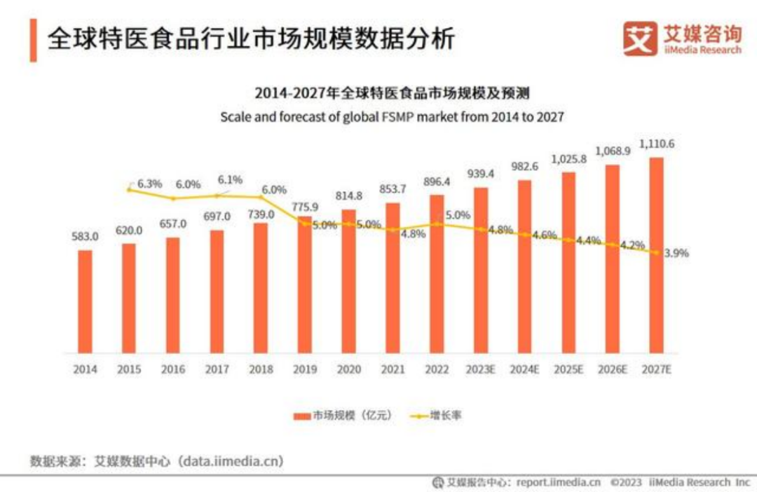 在世界范圍內(nèi),健康領(lǐng)域正在發(fā)生著新的變化,即在疾病到來時采取治療手段而逐漸轉(zhuǎn)移至治未病階段。在營養(yǎng)食品領(lǐng)域也是一樣,為患者提供經(jīng)過科學(xué)論證的營養(yǎng)配方,與藥品共同輔助疾病治療,能加快人體機能的恢復(fù),這一創(chuàng)新已經(jīng)在醫(yī)療體系中扮演越來越重要的角色。根據(jù)iiMedia Research數(shù)據(jù)顯示,2014-2022年全球特醫(yī)食品市場規(guī)模從583.0億元上升到896.4億元;預(yù)計2027年將突破千億大關(guān),達(dá)1110.6億元。隨著全球人口老齡化趨勢加劇,平均預(yù)期壽命繼續(xù)增加,特醫(yī)食品行業(yè)成為大健康產(chǎn)業(yè)的新藍(lán)海,市場規(guī)模將會進(jìn)一步擴大。