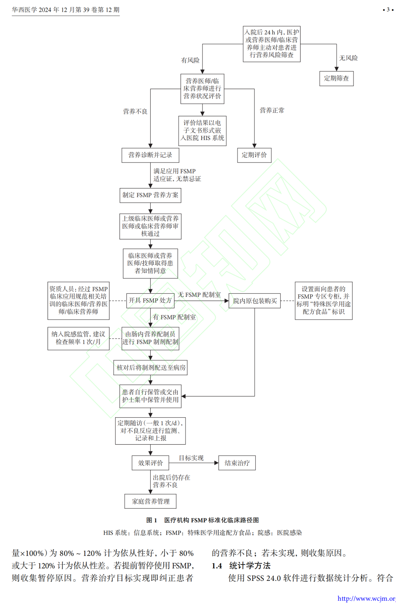 研究團(tuán)隊(duì)在南京大學(xué)醫(yī)學(xué)院附屬鼓樓醫(yī)院、郴州市第一人民醫(yī)院、宜賓市第二人民醫(yī)院進(jìn)行了FSMP標(biāo)準(zhǔn)化臨床路徑的試點(diǎn)研究。研究對象為2023年11月10日至11月30日期間在這三家醫(yī)院使用FSMP的住院患者。研究方法參考了國內(nèi)外文獻(xiàn)、政策法規(guī)以及前期構(gòu)建的評價(jià)指標(biāo)體系,形成了FSMP標(biāo)準(zhǔn)化臨床路徑圖,主要環(huán)節(jié)包括營養(yǎng)篩查、營養(yǎng)狀況評價(jià)、營養(yǎng)診斷、處方開具、配制、配送和隨訪。